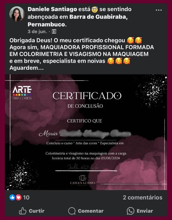 Todos os dias, uma nova maquiadora se transforma com o certificado do Arte das Cores.