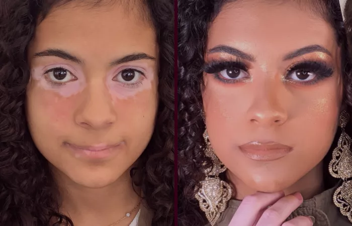 Demonstração de maquiagem na prática maquiando uma modelo com vitiligo que gostaria de cobrir as manchas.
