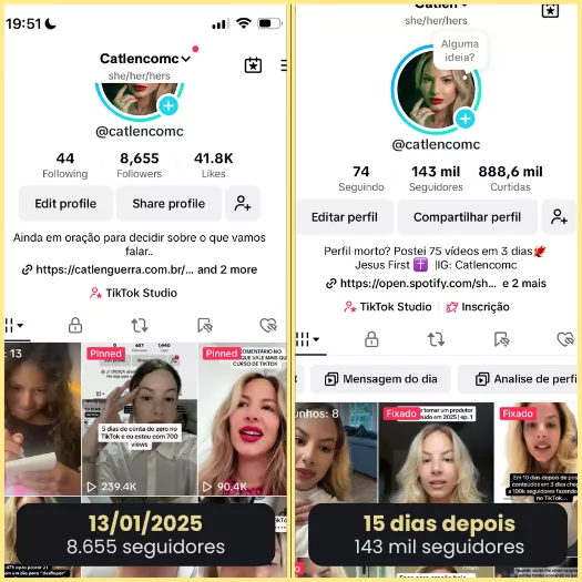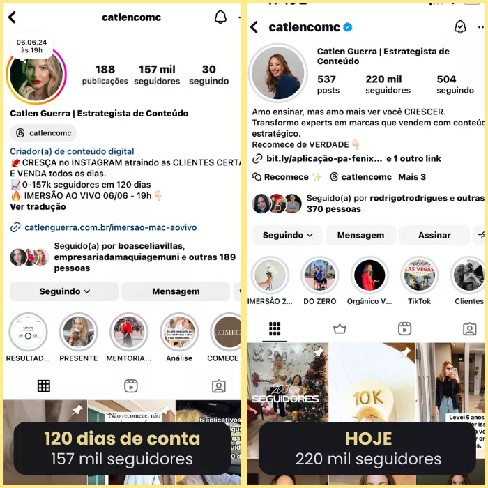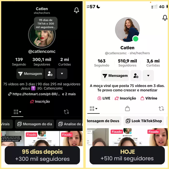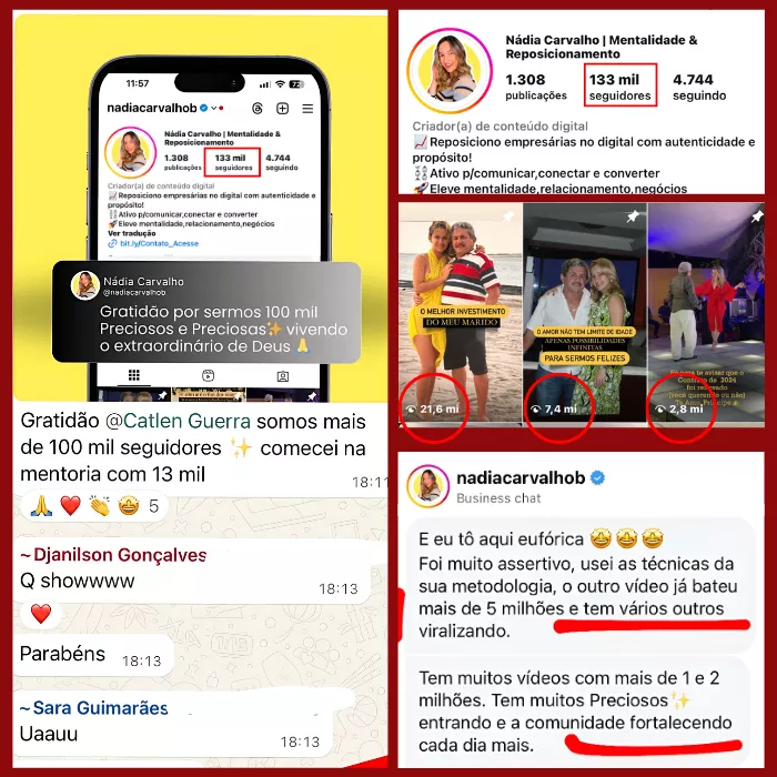 Baseado e testado pela própria Catlen, que cresceu mais de 500 mil seguidores em menos de 11 meses aplicando exatamente essa metodologia.