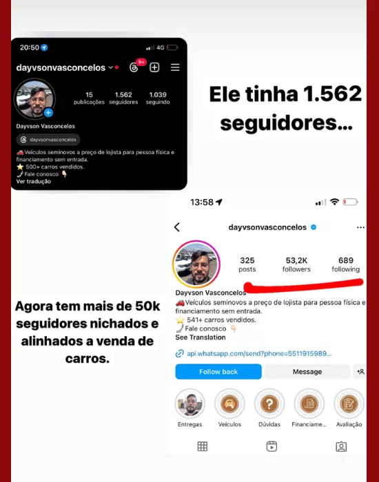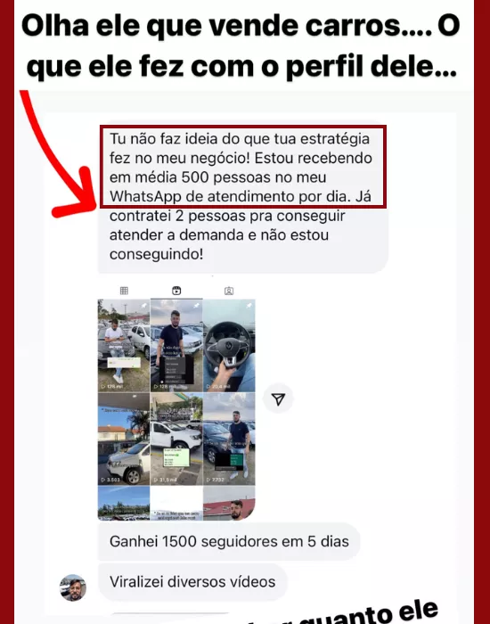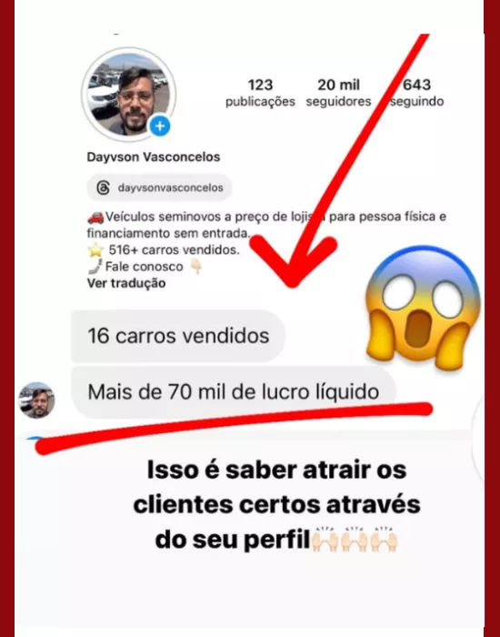 “16 carros vendidos e mais de 70 mil reais de lucro líquido! Passei de 1562 seguidores para mais de 20 mil. Nunca imaginei que fosse possível alcançar tanta gente e vender tanto em tão pouco tempo.”