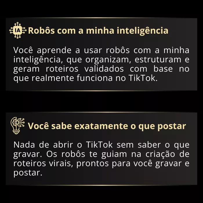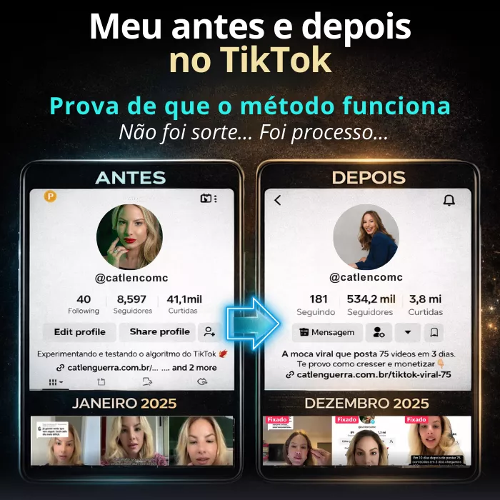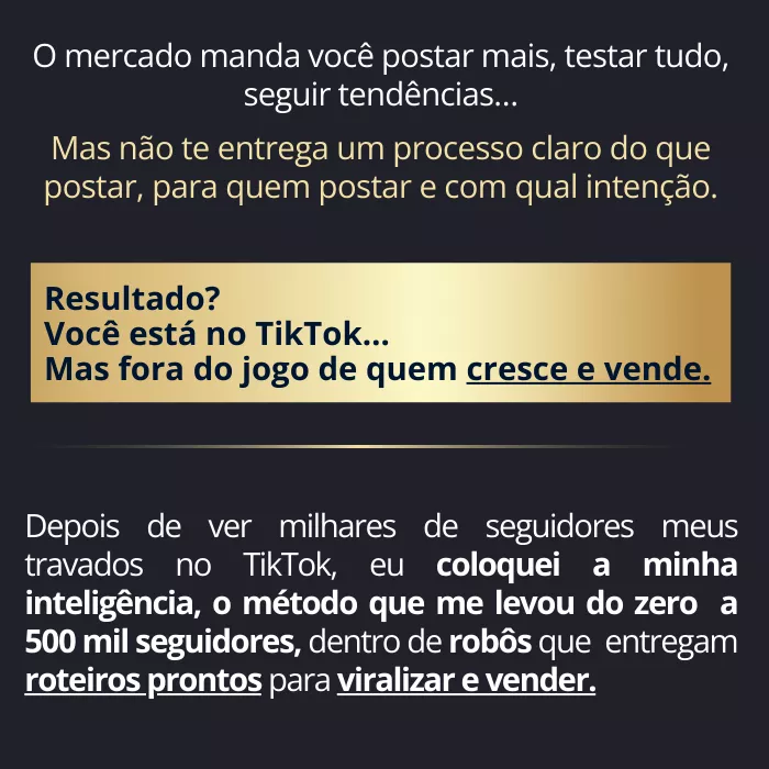 É exatamente esse método, testado, validado e prático, que eu coloco dentro do TikTok Viral 75, pronto para você copiar, aplicar na sua conta e acelerar com a ajuda dos meus robôs de IA.
