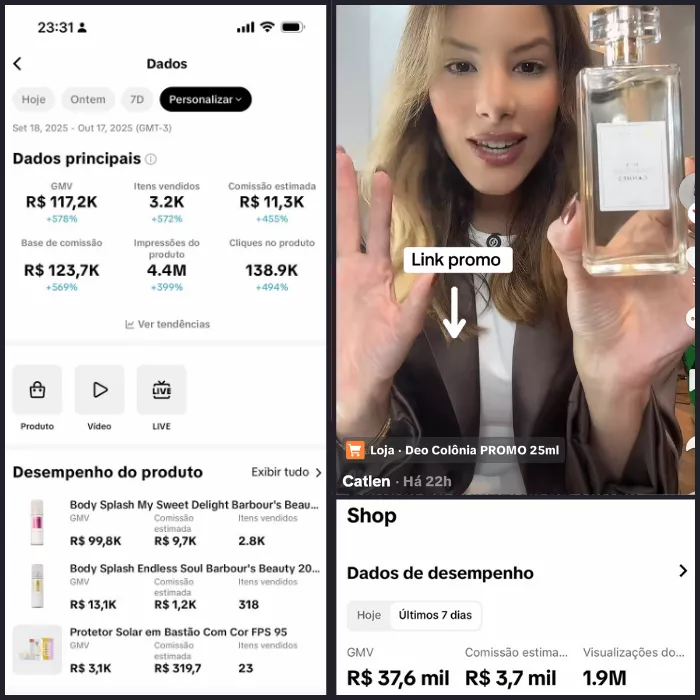TikTok Shop, Creator Rewards e vendas acontecendo.
